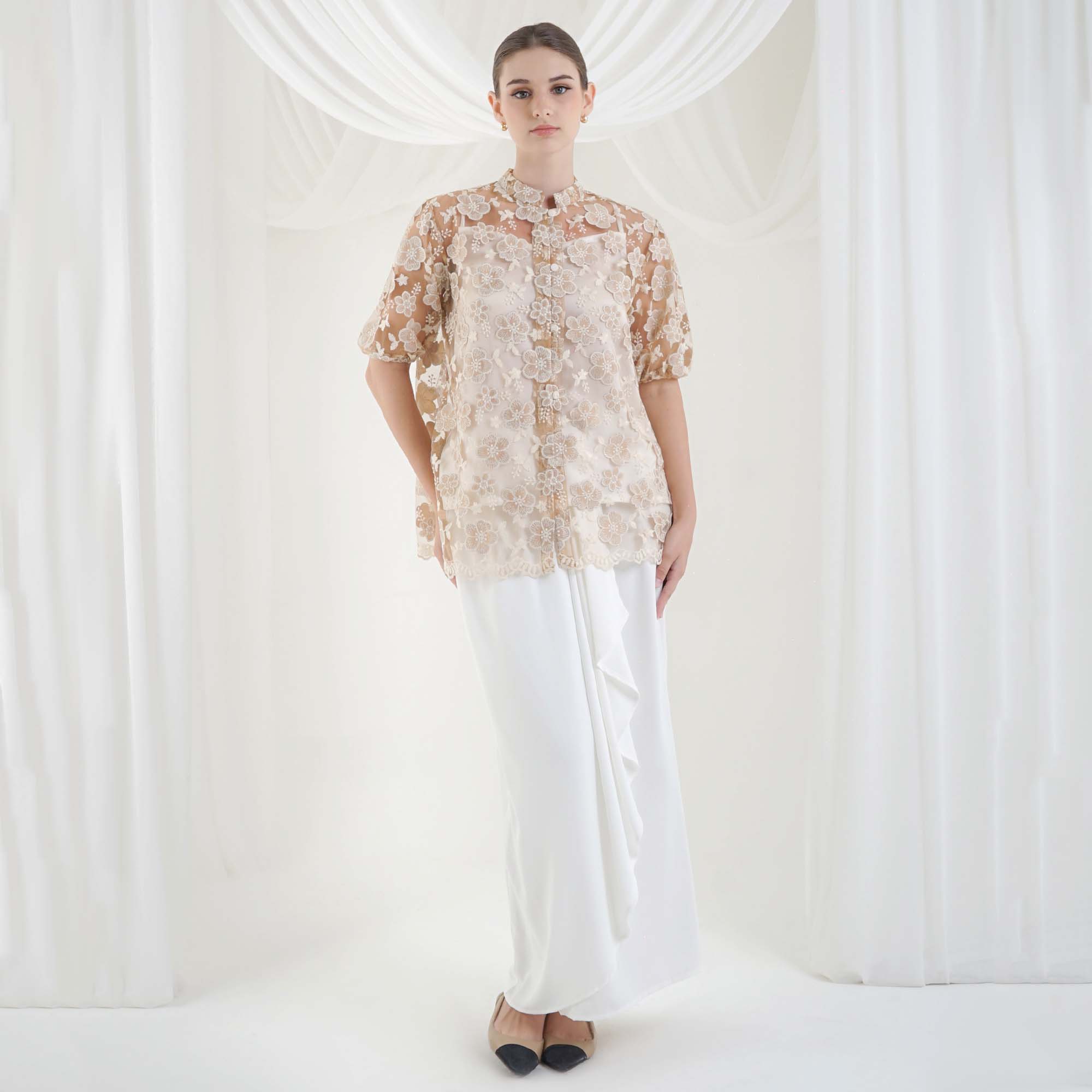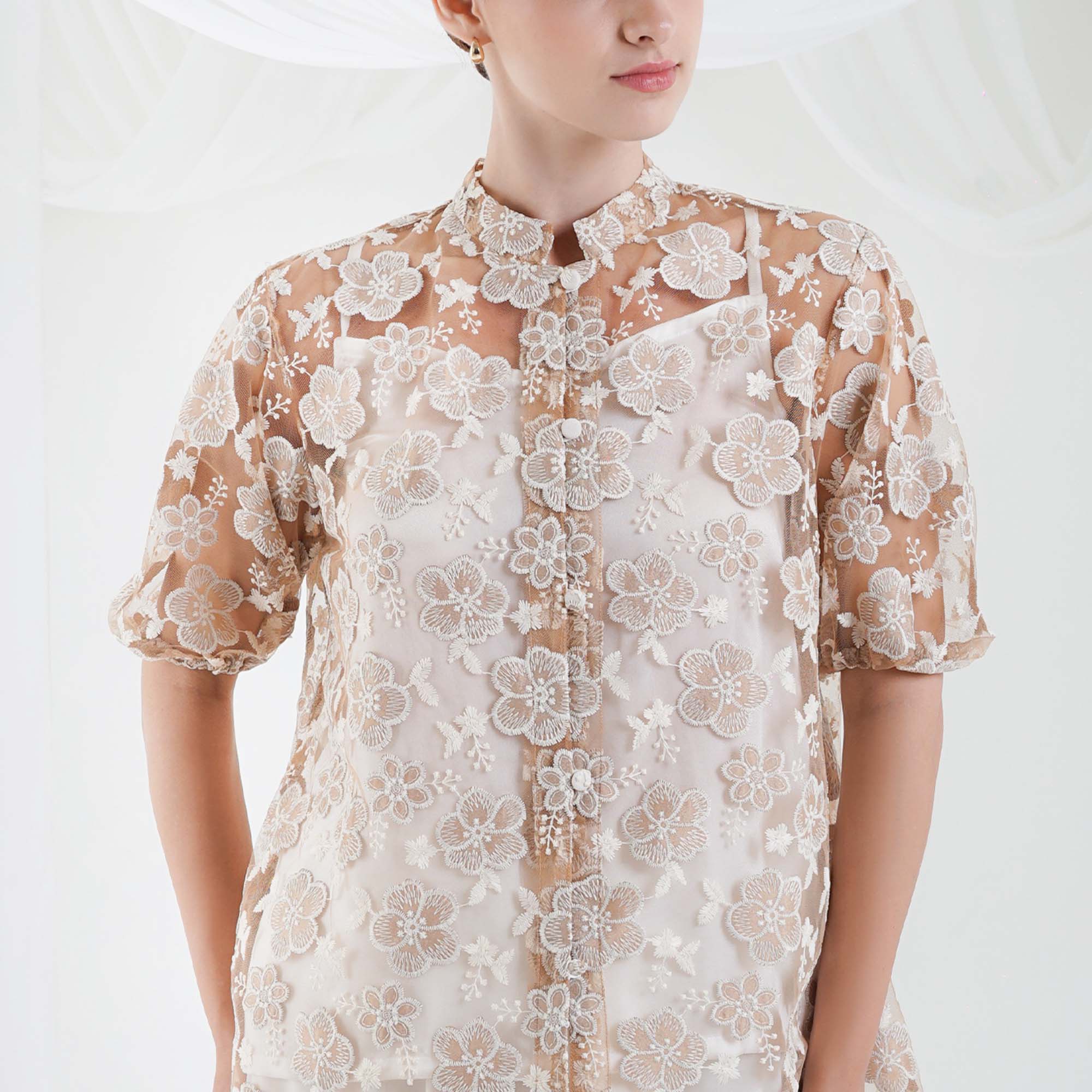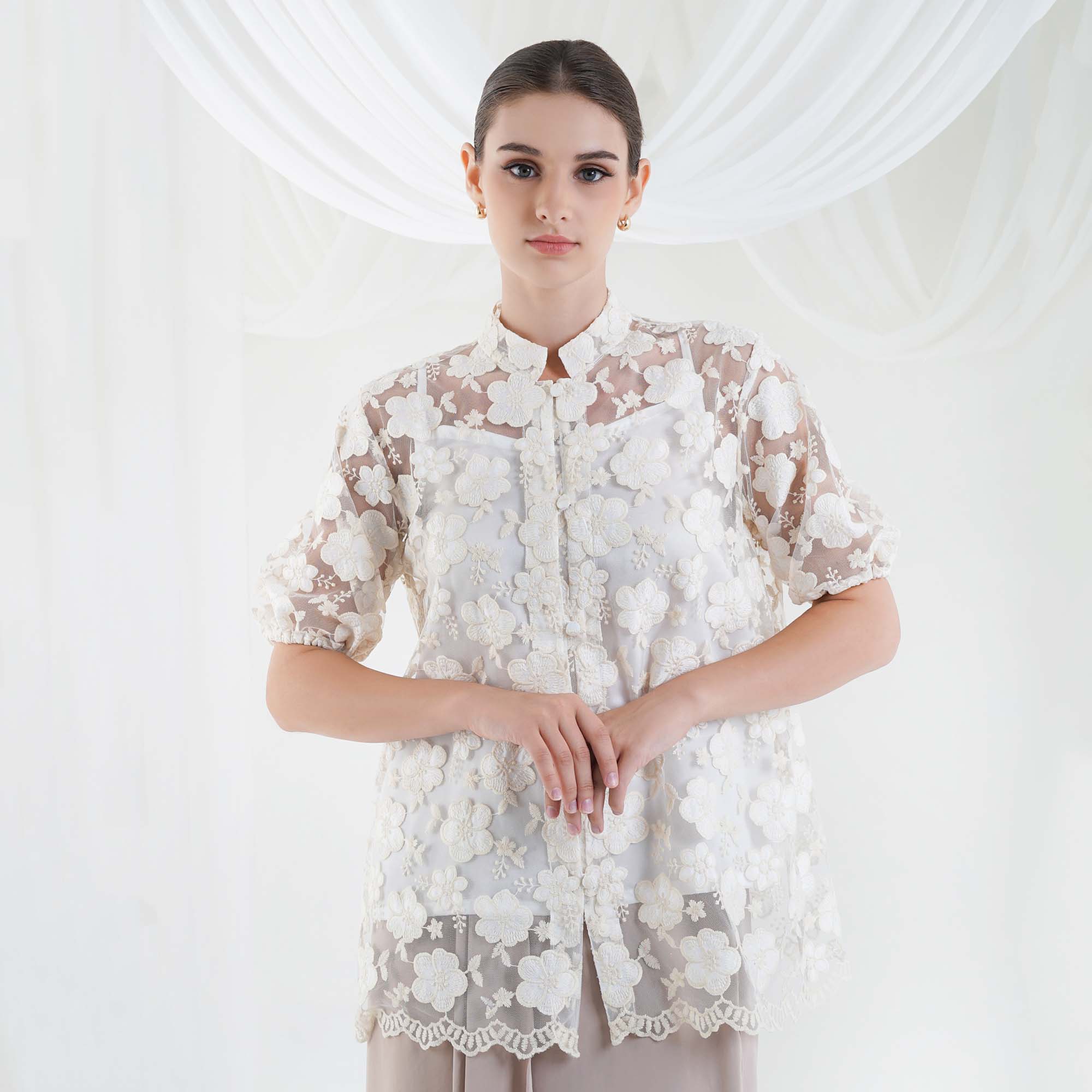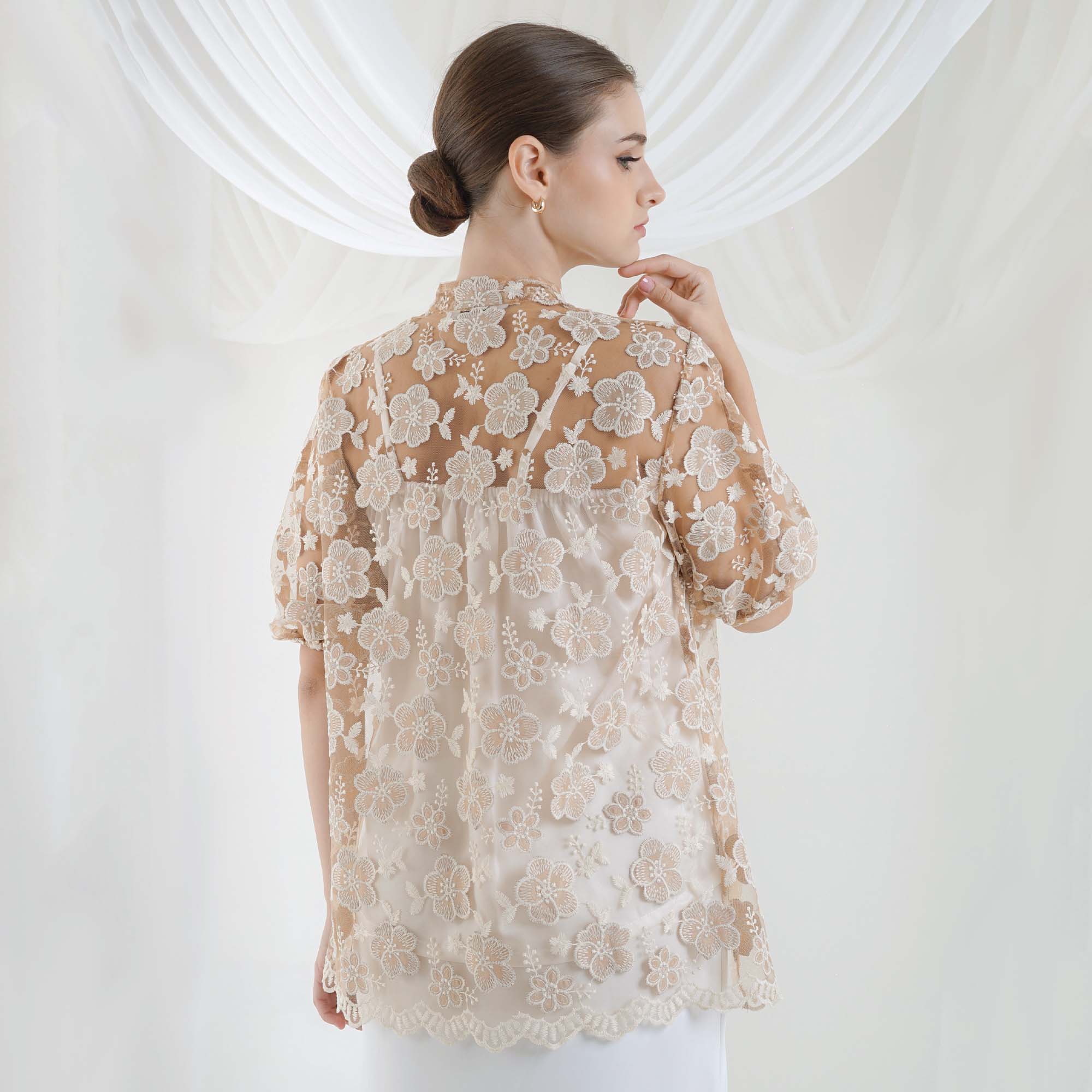 Aluna Top is a women’s top made from embroidered tulle with soft floral motifs. Designed with short puff sleeves, a high neckline, and a front button closure, it offers a sweet yet polished look. Perfect for Eid celebrations, this top feels special while remaining light and comfortable to wear.