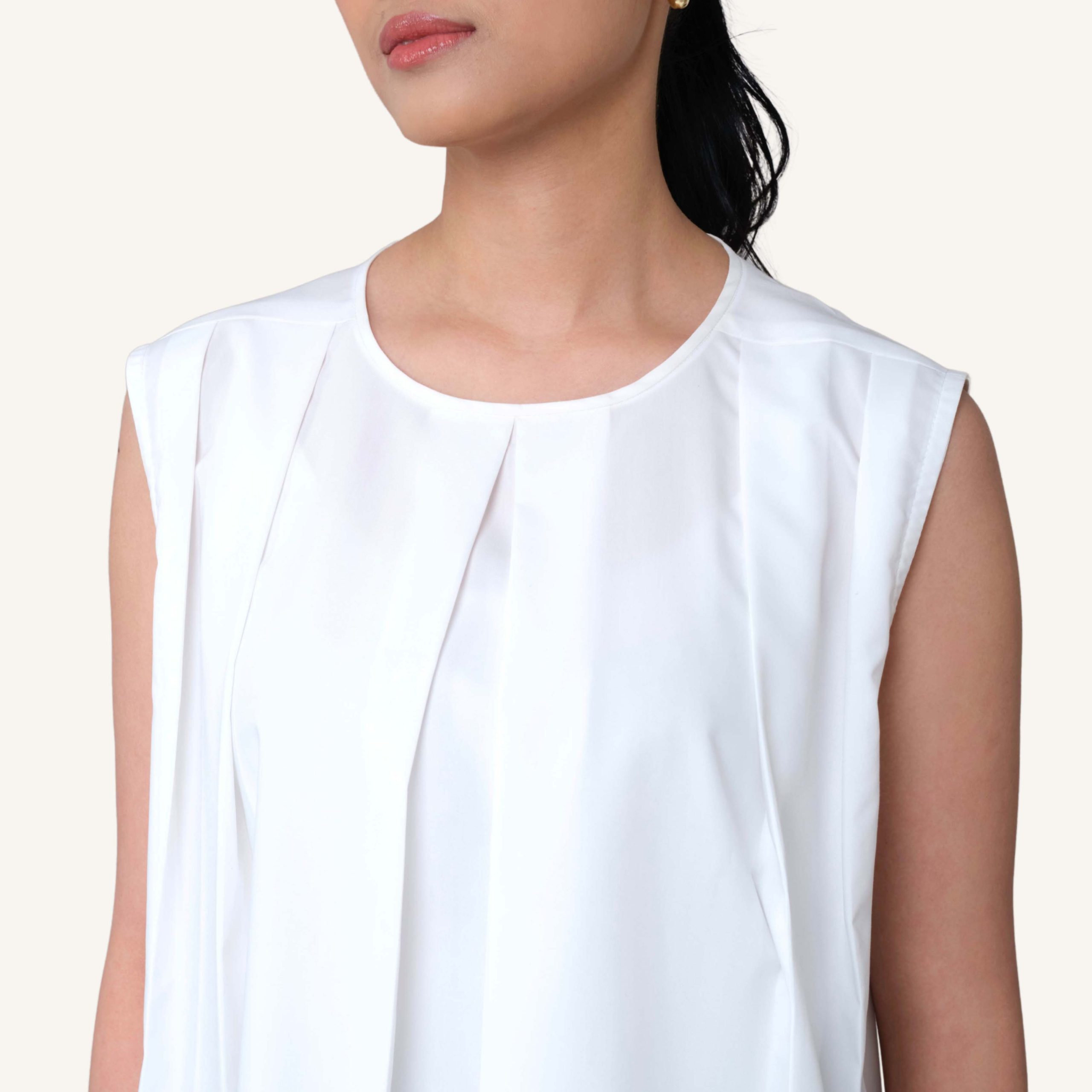 This sleeveless pleated top offers a chic, feminine look with its delicate pleating that adds texture and movement.