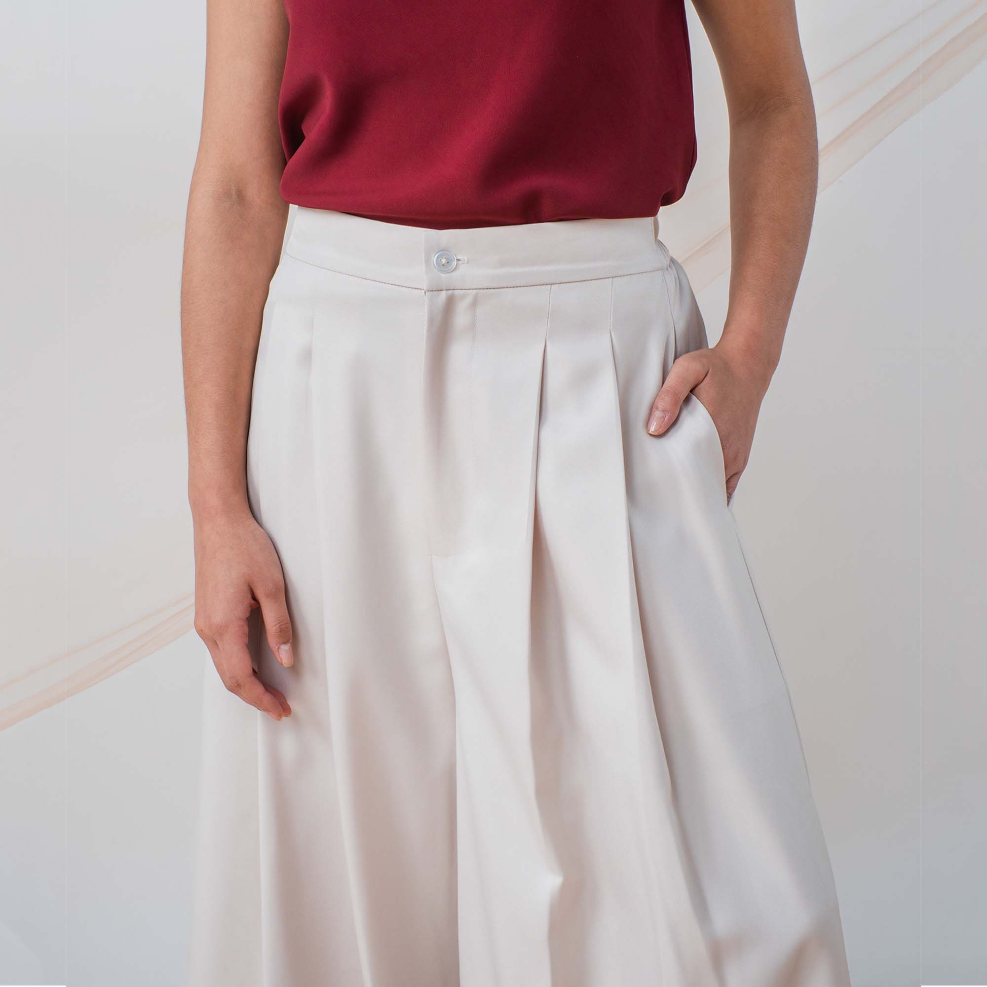 These pants feature a striking long dart detail that runs down the front, creating a sleek, tailored look and adding a touch of sophistication to the design.