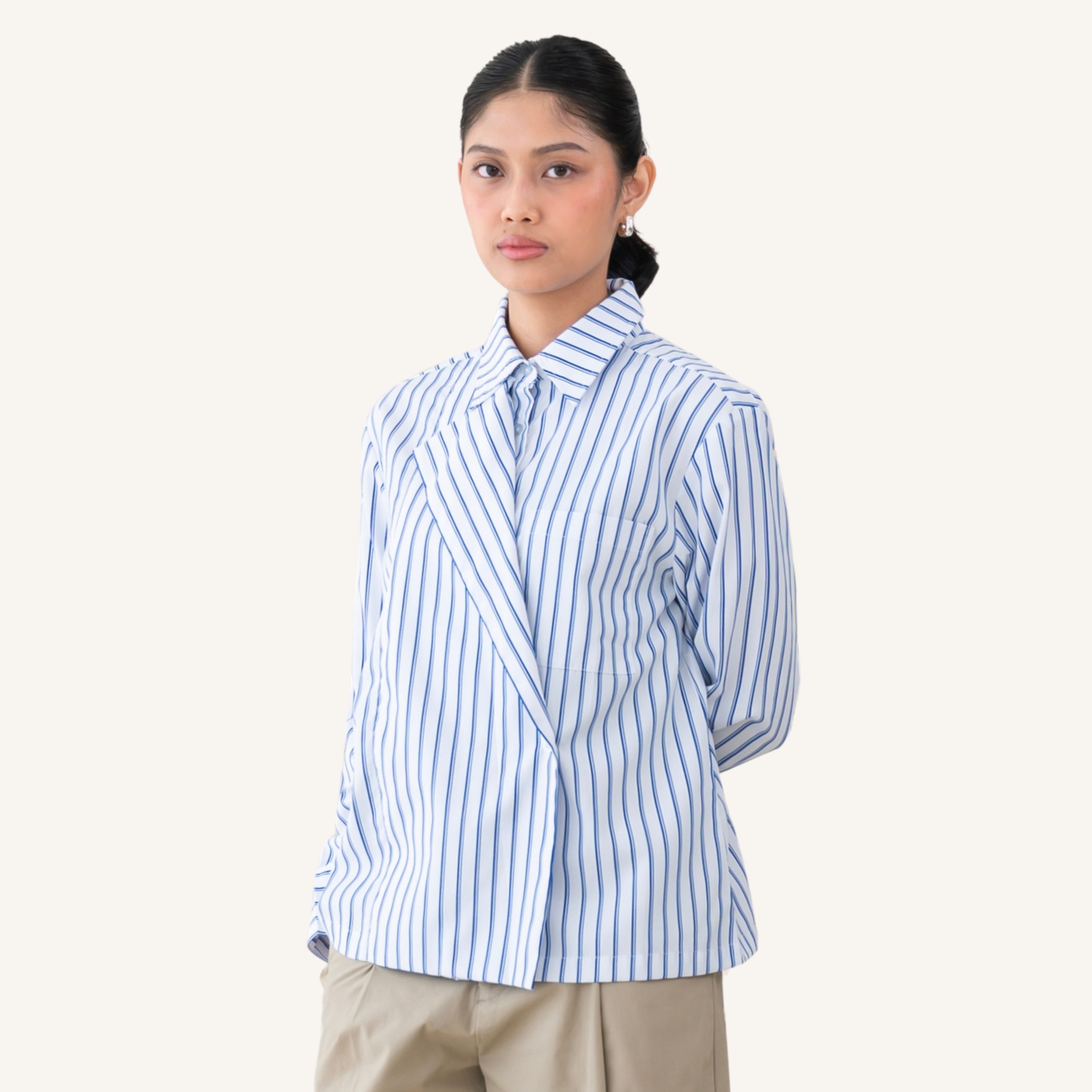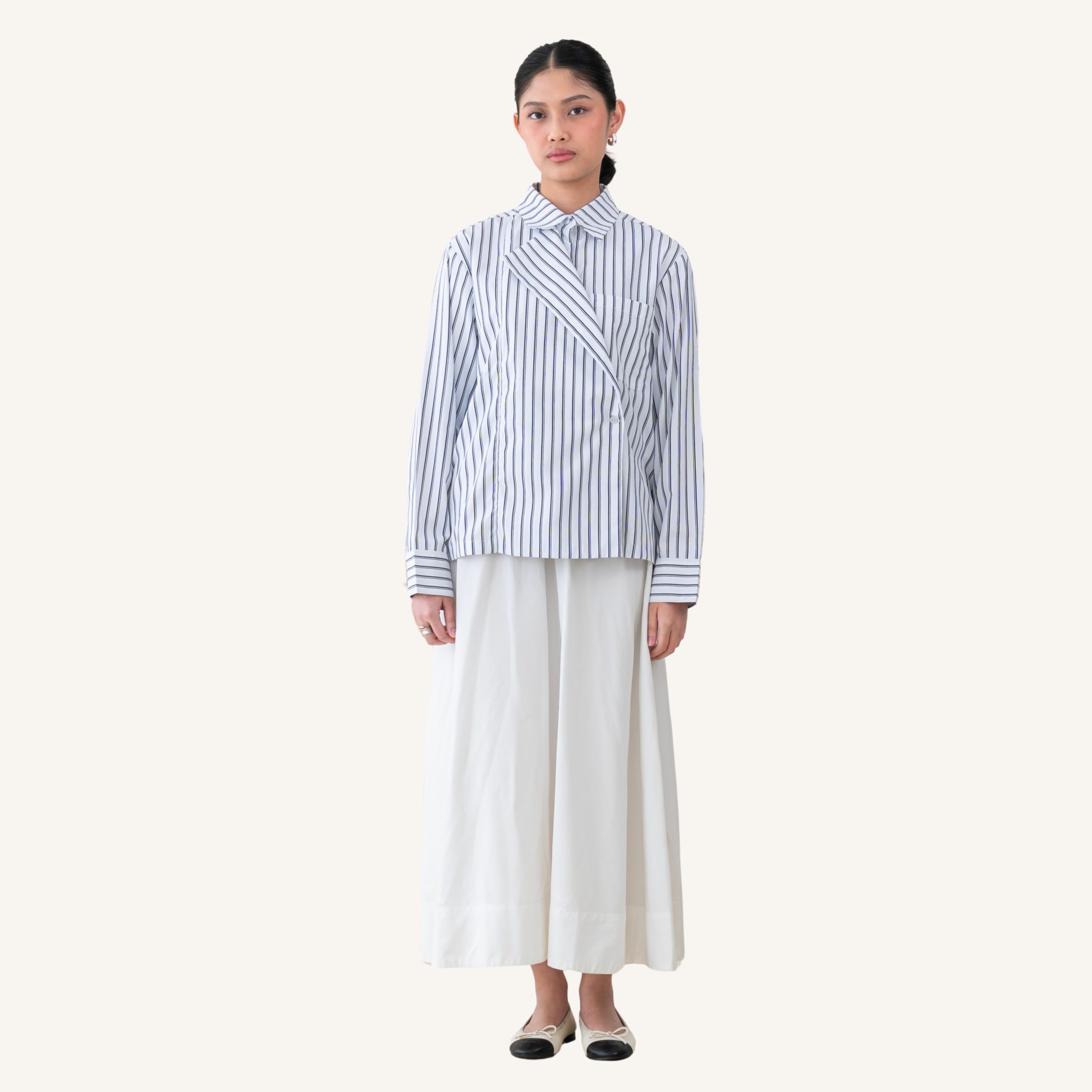An asymmetrical button-down shirt with a standout off-center front flap that creates a layered, diagonal design across the chest.