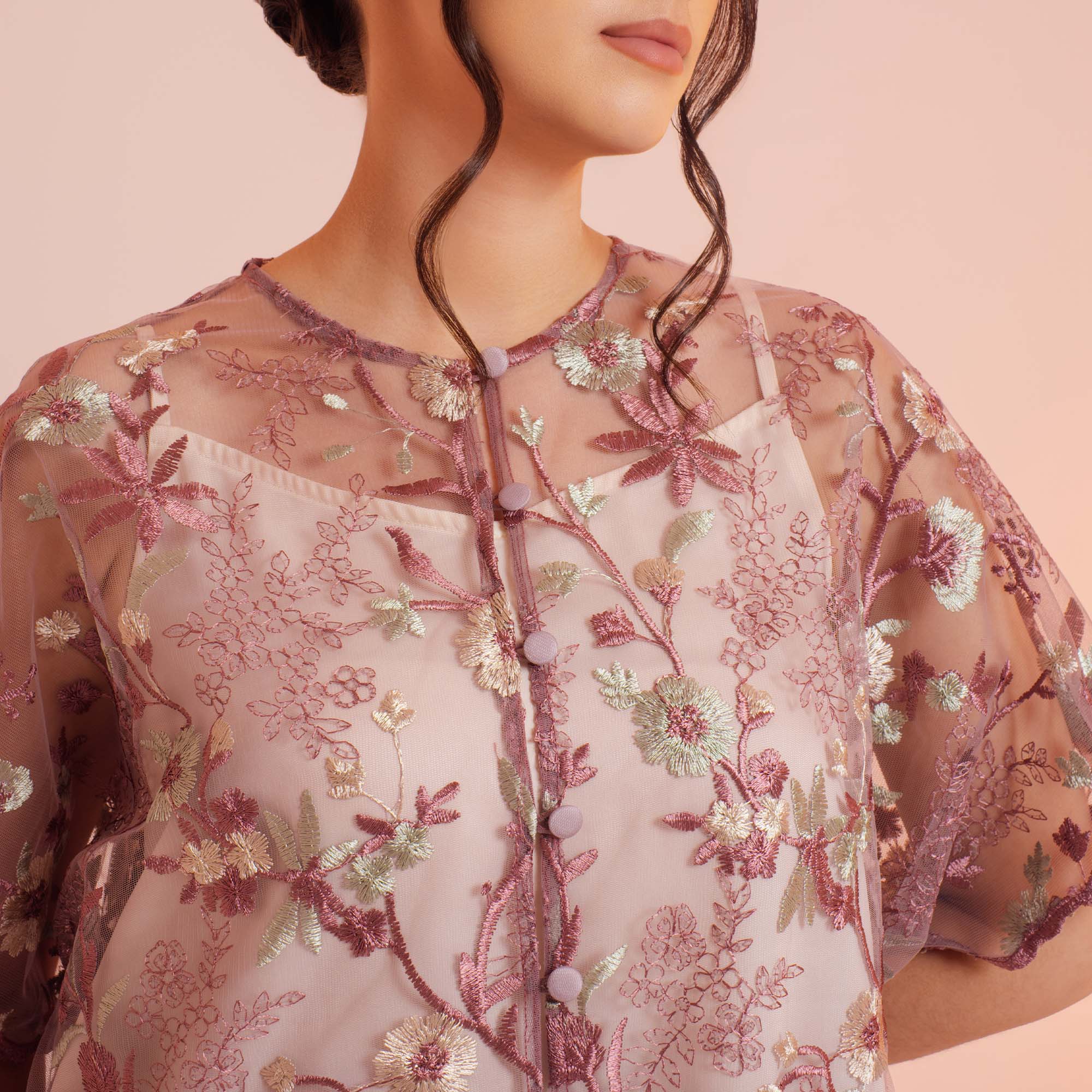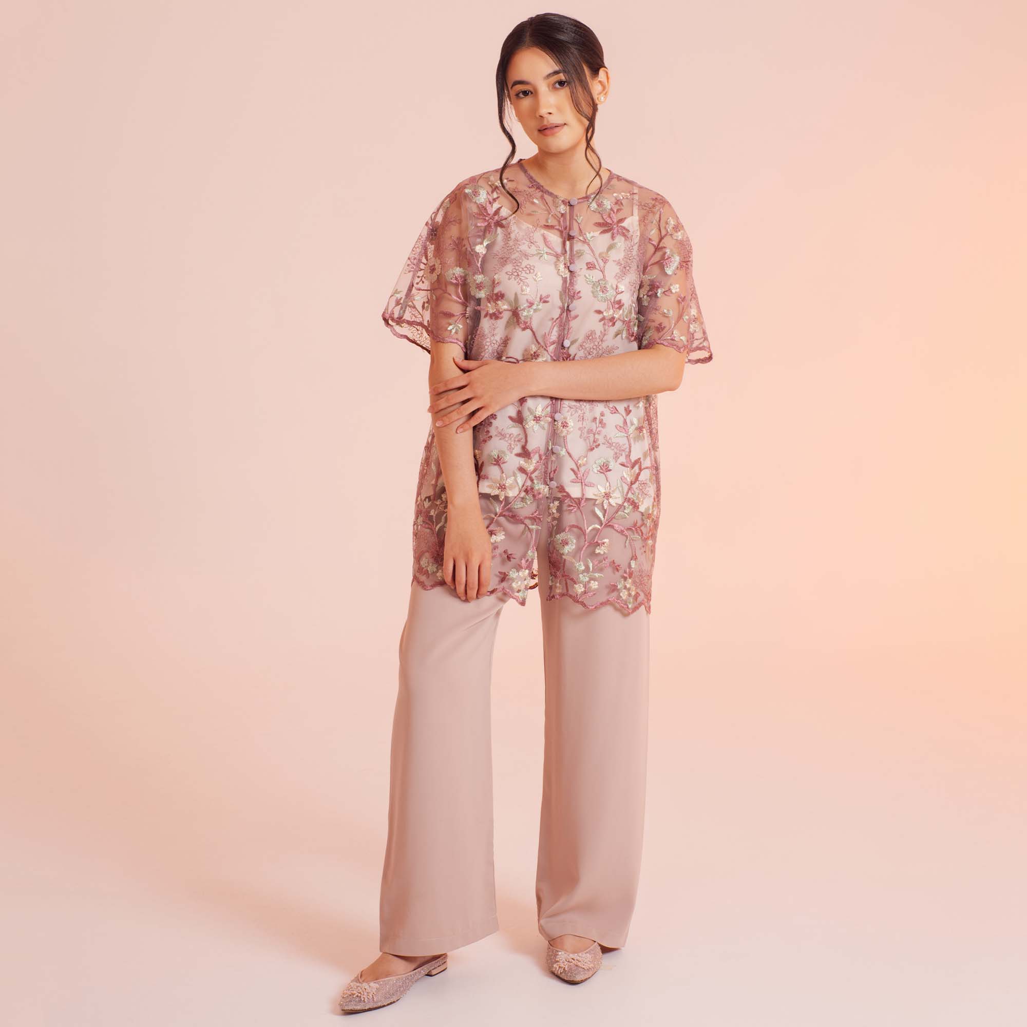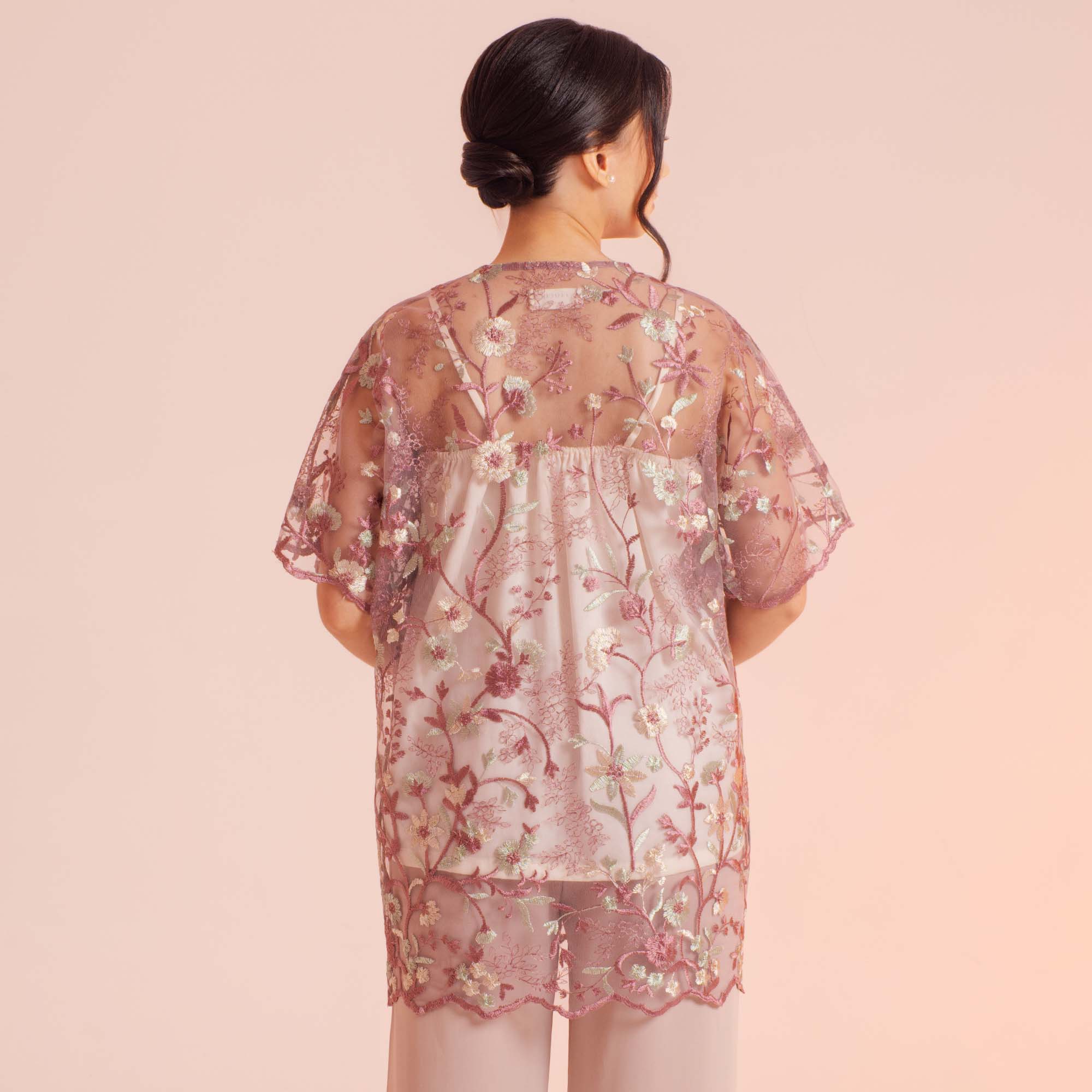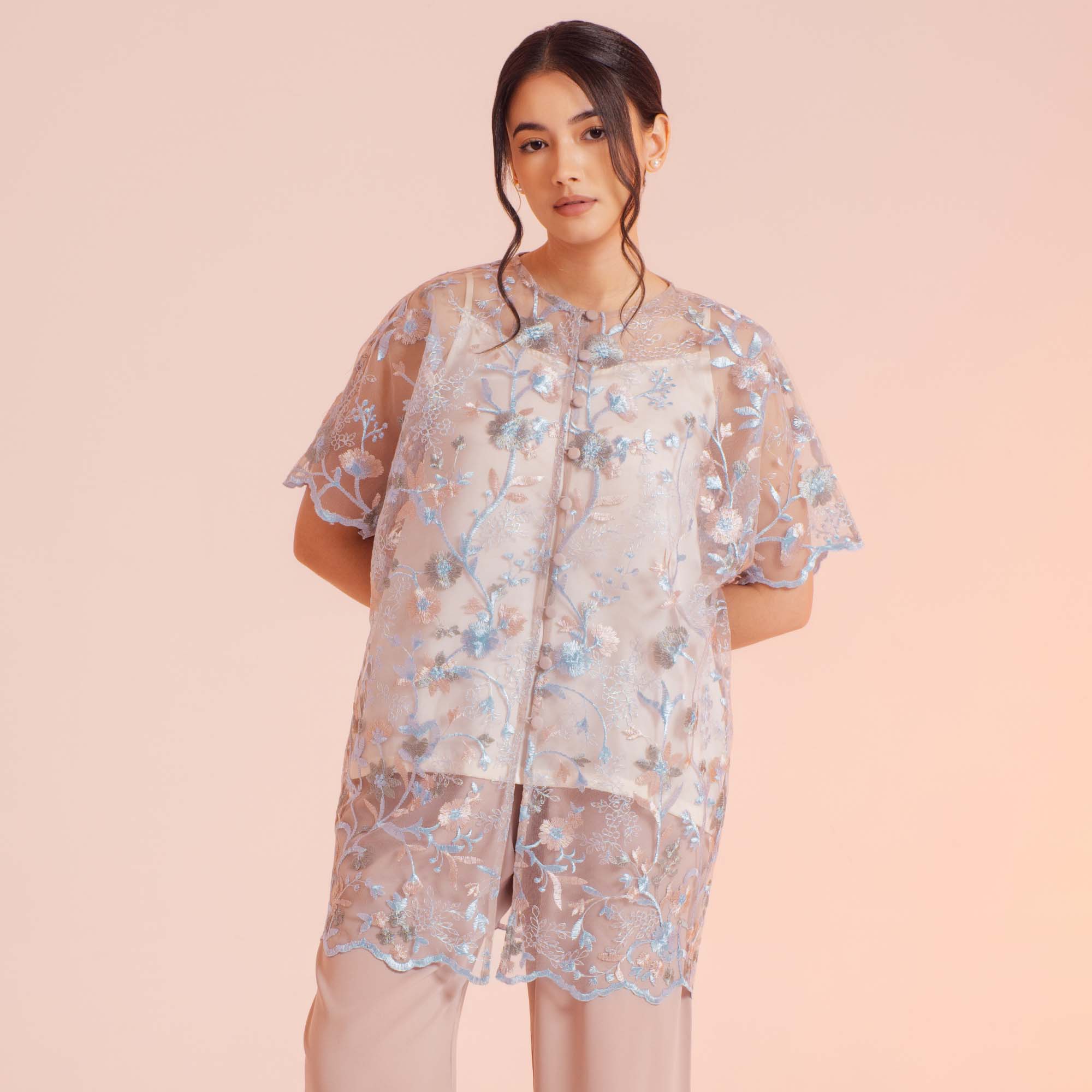 Safa Blouse exudes effortless elegance with its flowy batwing sleeves, lightweight tulle fabric, and chic front-button details designed for ease and comfort.